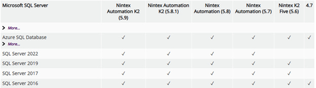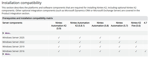 After the upgrade path is determined, the next step is to refer to the Nintex K2 Product Compatibility matrix to cross reference the current Windows Server and SQL Server versions currently installed against what is supported by the intermediate and target versions of K2.